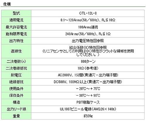 ・汎用・標準品の小型電流センサ(CTL-6P・-6S)と巻線数(800ターン)共通で適用電流を120Aまで拡大した電気仕様共通の上位機種です。