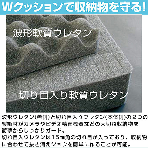 【特長】●2種類のウレタンで収納物をしっかり守るアルミトランク。●本体側、蓋側の2種類の軟質ウレタンが収納物を衝撃から保護します。●本体側の切れ目入り軟質ウレタンは15mm角の切れ目があり、収納物に合わせて抜き形状を作成できます。●ウレタンを外すことで、大容量のツールケースとして使用できます。●着脱可能なツールパネル付き。●内装はメルトン仕上げ。●開閉時に便利なステーを標準装備。●ショルダーベルト付きで、持ち運びに便利。【用途】●各種工具、カメラ、ビデオ、精密機器の収納、持ち運びに。【仕様】●外寸:450×330×135mm●内寸:435×315×120mm●工具パネルサイズ:420×300mm●切り目入り軟質ウレタンサイズ:435×315×65mm●波型軟質ウレタンサイズ:435×315×45mm●重量:4.1kg●色:シルバー●付属品:ショルダーベルト、カギ(2個)※写真はイメージです。※在庫切れの場合は別途御相談させて頂きます。※RoHS証明は間接材としての使用に限ります。(証明対象は製品又は部品のみで包装材・ケース等は含みません)※RoHS対応状況:製品ごとに異なりますのでメーカーホームページより御確認ください。