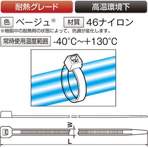 ●46ナイロンは、66ナイロンと比較し、高い耐熱性を持ち、また耐油性にも優れています。66ナイロンでは物理的に使用できない分野での結束に最適です。●樹脂中の耐熱材の状態によって、色調が変化します。