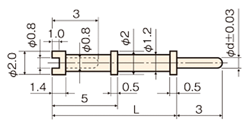 ●材質:快削黄銅(C3604BD) ●処理:金メッキ0.1μ(下地ニッケル2μ) ●d=0.8●L=10