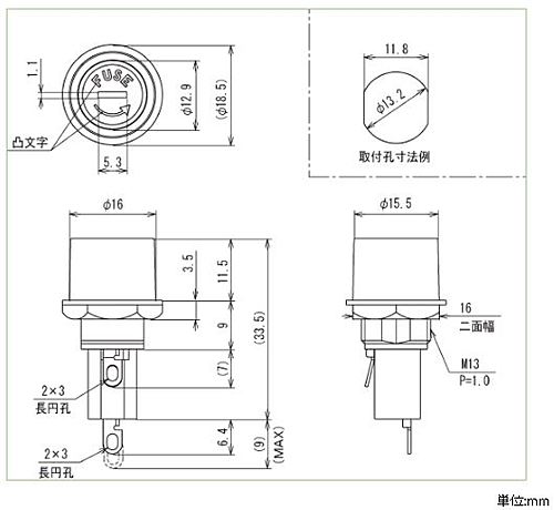 ■定格:250V-10A ■絶縁抵抗:DC500V、100MΩ以上 ■耐電圧:AC1500V(1分間) ■取得規格:UL規格・CSA規格 ■主絶縁材(本体):フェノール(UL94V-0) ■主絶縁材(ツマミ):P.B.T.(UL94V-0) ■端子金具:はんだ付け用端子 ■本体色:B(黒) ■取付板厚:3.5mm(MAX) ■ナット締付けトルク:0.7N・m以下 ■ツマミ締付けトルク:0.4N・m以下(推奨工具マイナスドライバー) ■ナット二面幅:16mm ■使用上の注意: ①底部端子は可動式のため、束線等により端子の動きを妨げないようにしてください。また、配線後、端子にリード線の張力等が加わらないように周囲の配線等にご注意ください。 ②規格品としてご使用の場合は、規格上の制約等をご確認ください。 ※写真はイメージです。 ※在庫切れの場合は別途御相談させて頂きます。