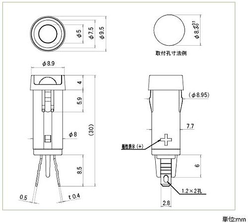■仕様 耐電圧:AC500V (1分間) 絶縁抵抗:DC500V、100MΩ以上 本体材質:ポリカーボネート 主絶縁材:PBT 端子金具:はんだ付け兼用110タブ端子 (t0.5用) 本体色:B (黒)、W (白) レンズ色:R (赤)、G (緑)、Y (黄)、BL (青) パネル取付方式:ワンタッチ装着 取付板厚:0.5~2.0mm 使用上の注意: ①本製品には保護抵抗は内蔵されておりませんので、使用電圧に合わせた保護抵抗を直列に接続してご使用ください。②接続の際は極性にご注意ください。③取付板厚によって取付孔寸法が異なる場合もありますのでご確認ください。 ※在庫がある場合がございますので、お問合せください。
