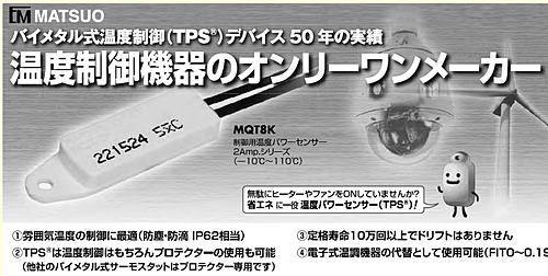 温度パワーセンサー(TPS) 【寸法】 44 × 12.5 × 6.4mm 【定格】 AC125V/50mA~2A、AC250V/50mA~1.3A、DC12V/50mA~2A、DC24V/50mA~1.3A (開閉寿命:定格負荷において10万回) 【動作温度】 温度下降5℃以下ON、温度上昇11.5℃以上OFF、ディファレンシャルCランク(6.5K) 【特長】 小ディファレンシャルで高精度、電気的寿命は10万回以上、雰囲気温度を検知可能、電子サーモスタットの代替が可能なコンパクト制御機器 【アプリケーション】 凍結防止ヒーター制御用 ※他の温度をご希望される場合やその他詳細をご希望の場合は右上お問合せボタンよりお問合せをお願い致します。 ※写真はイメージです。