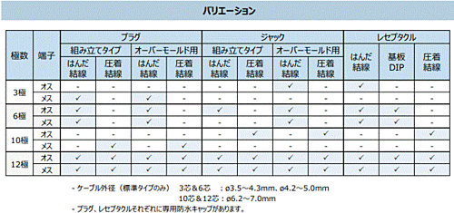 特徴 1.小型低背 2.防水構造:嵌合状態で、IP67、IP68 3.防水コネクタでありながら、操作性の良いプッシュプルロックを実現 4.軽量 5.クランプ構造:コード管を締め込むだけでケーブルクランプが可能 6.確実なロック:どこを持ってもロック可能な構造 7.複数のガイドキーにより、誤嵌合を防止 8.嵌合位置合わせのため、嵌合位置に白色マークあり 9.RoHS対応