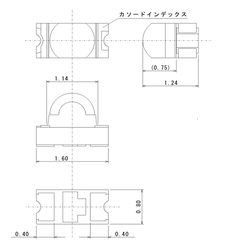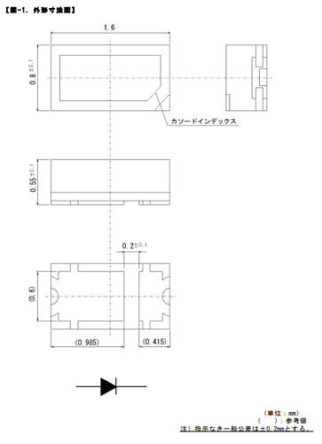 発光材料にInGaNを用い、波長変換材入り樹脂でパッケージしたリフレクター付き白色発光サーフェイスマウントチップLED 【特性】 パッケージタイプ:Reflector LEDタイプ:High Brightness アプリケーション:Amusement Data Storage Helthcare Home Appliance Industrial Equipment Office Equipment PC パッケージサイズ[mm]:1.6x0.8 (t=0.55) 発光色:White 光度(Single)(Typ.)[mcd]:2200 光度ランク数:3 色度(xy):(0.303 0.294) 順方向電圧 VF (Typ.) [V]:2.9 IF @ VF [mA]:40 素子材質:InGaN 許容損失Pd [mW]:144 動作温度範囲[℃]:-40 to 110 保存温度範囲[℃]:-40 to 110