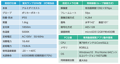 LED防犯灯にカメラと無線LANを組み合わせた複合防犯機器です。 (蛍光灯32W相当 20VA) ■特徴 ・カメラ付き防犯灯で20VA以下を達成。防犯カメラ付きで電力会社との契約電力を抑えてランニングコストを低減します。 ・専用アプリで無線通信による録画データの閲覧、ダウンロードが可能です。 ・録画データはAES-128暗号化で保存、セキュリティ対策も万全です。 ■用途例 (駐車場、駐輪場、工場、作業場、物流倉庫内など) ・車上荒らしなどのトラブル発生時の証拠記録等 ・事故や盗難などのトラブル発生時の証拠記録等 ・労災の状況把握、原因追及等 (ご注意) ・まとまった台数の場合は、別途見積の検討をさせて頂きますのでお問い合わせください。 ・本製品をご使用の際には、必ず事前に仕様の内容のご確認をお願いします。 ・記載されている絶対最大定格や使用上の注意事項等を逸脱して使用され、万一掲載製品の使用機器に 瑕疵が生じ、それに伴う損害が発生しましても、弊社はその責を負いませんので予めご了承ください。 ・本製品は、製品改良のため予告なしに仕様の変更をすることがあります。 ・メーカー在庫切れにより納期がプラス2~3か月間要する場合があります。 ※その他お問合せの際は、画面右上【お問い合わせ】フォームよりお問合せください。