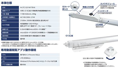 LED直管型カメラ(40形 G13/T8タイプ) ■特徴 ・配線工事不要! お使いのLED直管照明に配線工事不要※で簡単に監視カメラの設置ができます。 ・目立たない! 照明にカメラが組み込まれているので、威圧感の少ない監視カメラです。 ・専用アプリ付属! カメラの操作は付属の専用アプリで行い、無線LAN接続でライブ映像の閲覧や、録画ファイルのダウンロード、再生ができます。 ・セキュリティ! 無線LAN接続の際は、SSID/ パスワードの設定も可能、更に映像データも暗号化した上で 内蔵のmicroSDカードへ録画されるので、セキュリティ面も安心です。 ・角度調整機能! 口金の角度調整が可能で、カメラ画角調整が容易です。 ・日本製! 安心の日本国内製です。 ※LED対応済照明(G13口金直管・片側給電)の場合となります。詳しくは最寄りの工事店にお問い合わせください。 (ご注意) ・まとまった台数の場合は、別途見積の検討をさせて頂きますのでお問い合わせください。 ・本製品をご使用の際には、必ず事前に仕様の内容のご確認をお願いします。 ・記載されている絶対最大定格や使用上の注意事項等を逸脱して使用され、万一掲載製品の使用機器に 瑕疵が生じ、それに伴う損害が発生しましても、弊社はその責を負いませんので予めご了承ください。 ・本製品は、製品改良のため予告なしに仕様の変更をすることがあります。 ・メーカー在庫切れにより納期がプラス2~3か月間要する場合があります。 ※その他お問合せの際は、画面右上【お問い合わせ】フォームよりお問合せください。