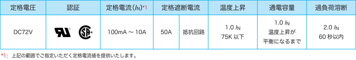 【特性】●定格電圧:DC72V●定格電流:100mA〜10A●定格遮断電流:50A●温度上昇:1.0 IN 75K以下●通電容量:1.0 IN 温度上昇が平衡状態になるまで●過負荷溶断:2.0 IN 60秒以内●溶断特性:耐ラッシュ【認証】●100mA-10A UL248-1、UL248-14 Recognized●100mA-10A CSA C22.2 No.248.1、CSA C22.2 No.248.14 Certified【特徴】●高耐熱性、高強度のセラミック容器による高遮断性能●内部構造のデザインにより外的温度の影響を抑制、薄膜タイプに比べ低抵抗●端子可動構造によりエレメントへの外的応力印加防止●巻線エレメントによる優れた耐ラッシュ性と高信頼性●エレメントと端子の溶接により基板実装時の熱的影響を抑制●RoHS2対応・鉛フリー●半田レス【その他】●標準納期は数量、時期によって変動することがございます。●受注単位数のご要望がある場合、別途ご相談ください。【アプリケーション】●DC-DCコンバータ●ICテスタ●PLC●アクチュエーター●カーナビゲーション●バッテリーマネジメントシステム●モータードライバー●DC二次回路●ECU●OA機器●USBチャージャー●インターホン●バッテリーパック●ポータブルデバイス●自動車用電子機器●複写機【製品情報ページ】https://www.socfuse.com/ja/products/detail/11ct速断タイプはこちら↓https://www.socfuse.com/ja/products/detail/11cf【用途例】●自動車急速充電器、自動運転●セキュリティガス検知器、火災報知器、監視カメラ、ホームセキュリティ●産業FA、ロボット、プログラマブルコントローラー、非接触給電、複合機、半導体製造装置、放送機器、計測器、POS、UPS、建設機械、自動販売機、感震計、アミューズメント、ドローン、電動工具●照明LED照明、蛍光表示管、調光機、イルミネーション●医療AED、医療用検査装置、医療用ロボット、医療用プリンタ●民生エアコン、ゲーム機、冷蔵庫、換気扇、インターホン、TV、パソコン、家庭用蓄電装置●情報通信トランシーバー、データセンター、基地局用設備、PBX