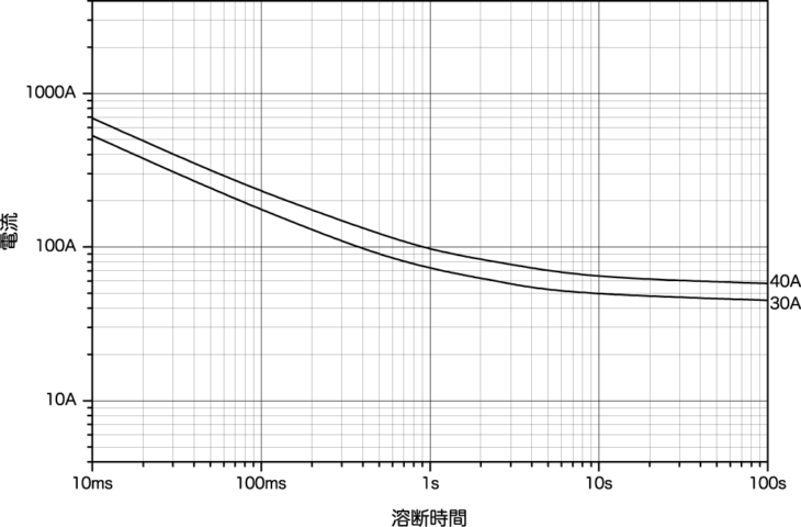 当社が試験条件を特定して測定した実測値の平均値をプロットしておりますので、保証値ではありません。ヒューズの特性は使用条件によって変化しますので、貴社のご使用条件下で、ヒューズが貴社のご要求を満足しているかを実際にご確認頂く必要があります。