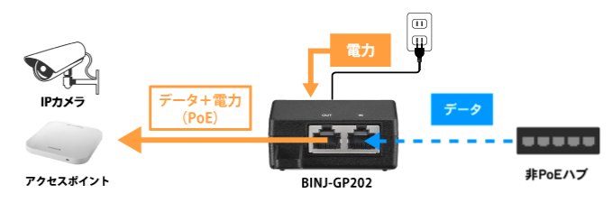 PoE給電に対応していない既存のネットワーク環境にPOE環境を追加電源確保が困難な環境へネットワーク機器を新たに設置する際に利用POE対応のネットワークカメラ、アクセスポイントの追加設置に利用※本商品は、室内利用に限ります。